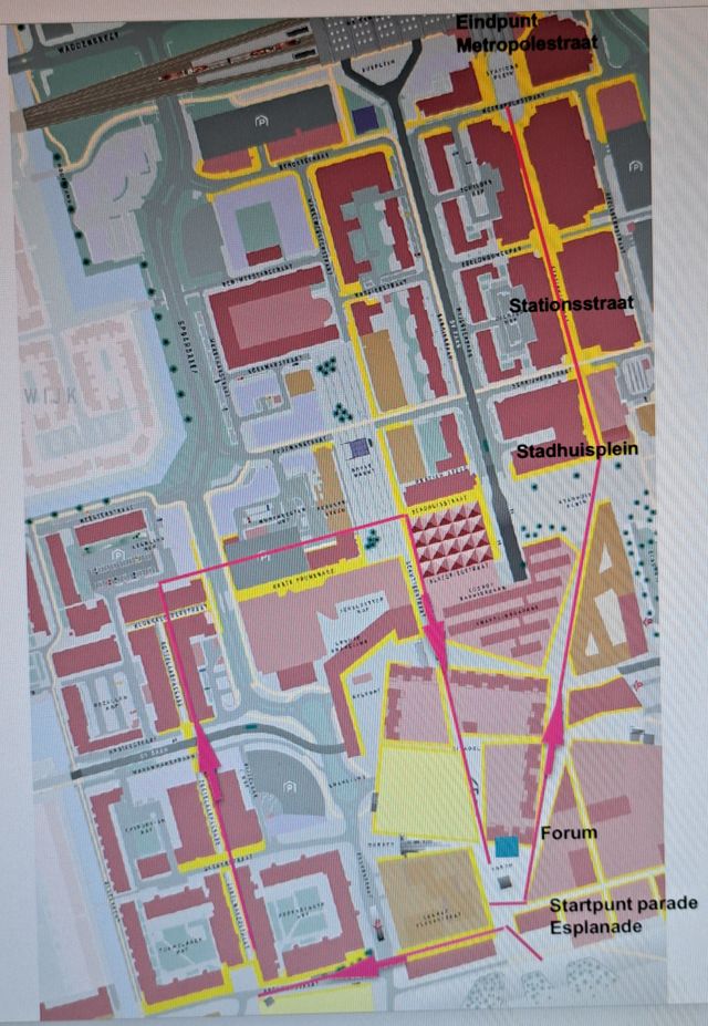 Route: Vanaf de Esplanade via de Traverse, Brouwerstraat, Zadelmakerstraat, Zoetelaarpassage, Spoordreef, Korte Promenade, Schutterstraat, Citadel, Forum, Diagonaal, Stationsstraat. Rond 16.00 uur einde bij het Stationsplein.