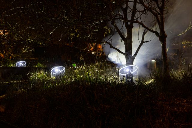 Het Schipperplein wordt door kunstenaar Robin Beekman volledig getransformeerd. In zijn werk onderzoekt Robin hoe licht de fysieke, visuele perceptie van ruimtes en landschappen kan ontregelen, ontgoochelen. Met licht als medium wordt dit kleine stukje Almeerse stadsnatuur een schouwspel van licht- en schaduw-contrasten, terwijl draaiende LED lichten de bomen en struiken laten branden in kleur. Door op de grens van visuele overprikkeling te werken ontstaat er ruimte voor nabeelden en licht-echo’s op het netvlies.
