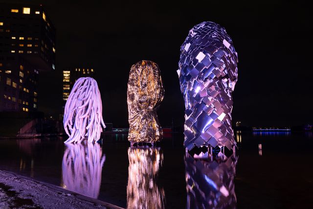 Op Stedenwijkstrand rijzen drie glanzende disco reuzen op uit het Weerwater. Samen vormen ze een band die het water tot hun podium maakt. Hun lichamen weerkaatsen het landschap en het landschap weerkaatst hun lichamen, waardoor steeds nieuwe beelden ontstaan. Soms bewegen ze rustig, soms stormachtig, maar altijd in samenspel met hun omgeving. Bezoekers worden uitgenodigd om stil te staan en mee te gaan in dit spel van reflectie en verbeelding.
