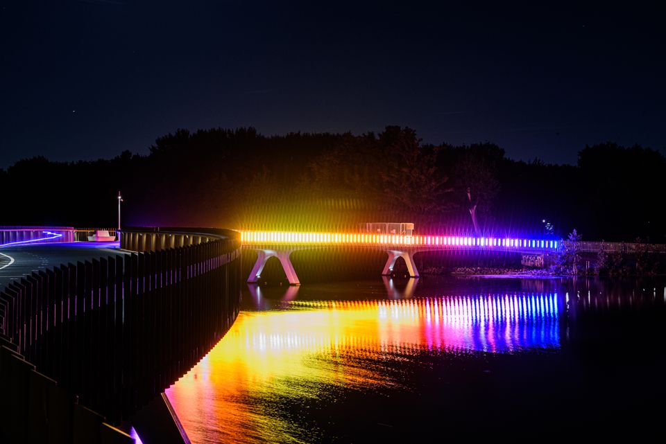 Eternal Sundown is the urban sun of the future. Also the future of Almere, a future of natural growth. Above the Weerwater lake, the work of art on the Weerwater Bridge is a technological sun at night and, indeed, one that can only be fully experienced after sunset. This work of art consists of dozens of coloured fluorescent lights - a spectacular sight, with its magical reflections in the Weerwater and its post-apocalyptic presentation of the clash of light and environment.