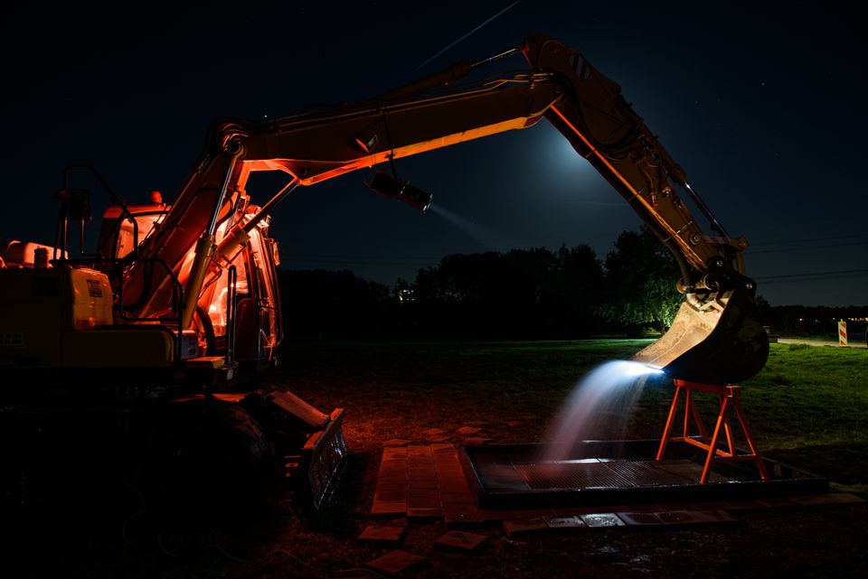In Lumière Park, on the banks of the Weerwater, a lone excavator produces a small but elusive miracle. A magical stream of water runs uninterruptedly from the digging bucket into the ground, as if the digger has tapped into an ancient, mythical source of water. A technological waterfall, with no origin, no function. But full of suggestion as to the magical meaning of water - a connector in this landscape so rich in history.