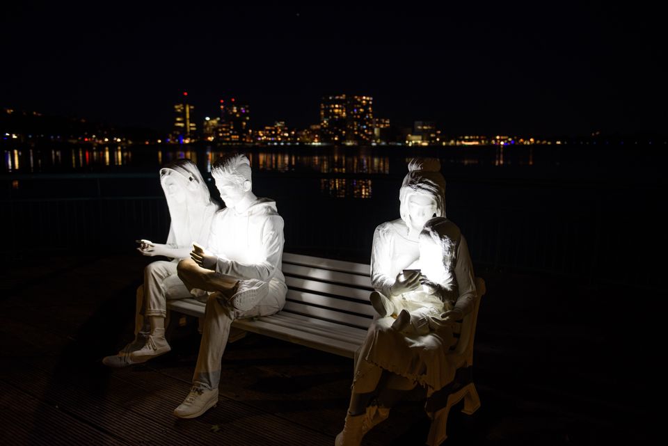 It’s an absolutely unique bench, in a city, with a view over the Weerwater lake. Yet it appears that the other three humans on the bench are completely absorbed in their digital lives. Glued to their smartphones. If you sit down next to them, you have to make a choice. Will you absorb the surroundings, or surrender to the digital lure of our times? We can all identify with this, only too well, as we are all, often, smartphone addicts. Like the other three. With our heads somewhere very far away from where our bodies are we are, technologically, absent.