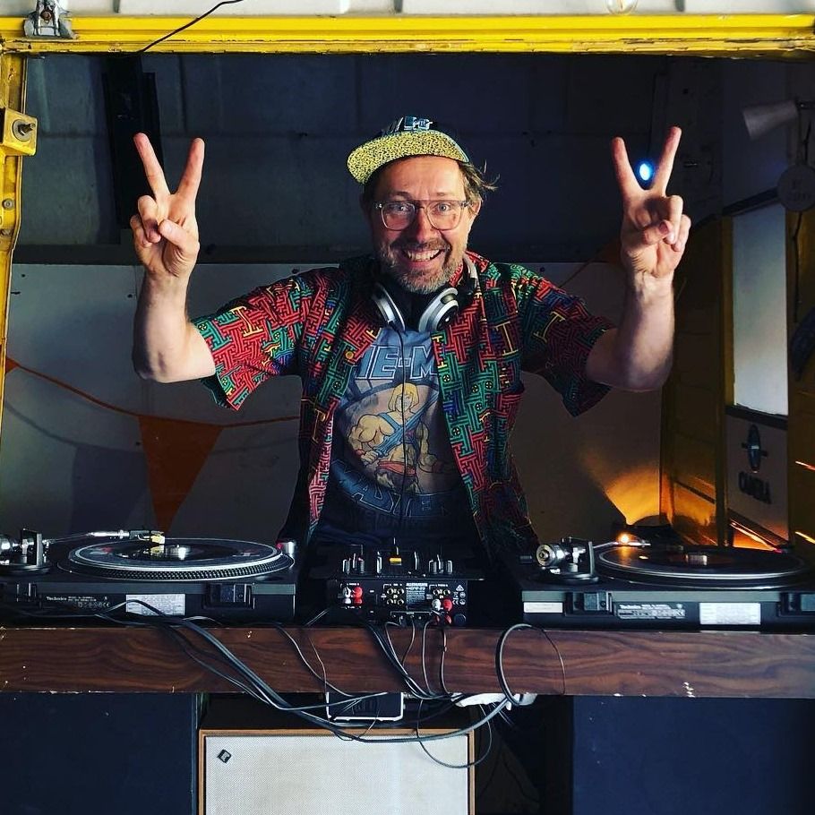 DJ Kringloop plays the most brutal records on the Hortus catering square from his canary yellow Volkswagen van.