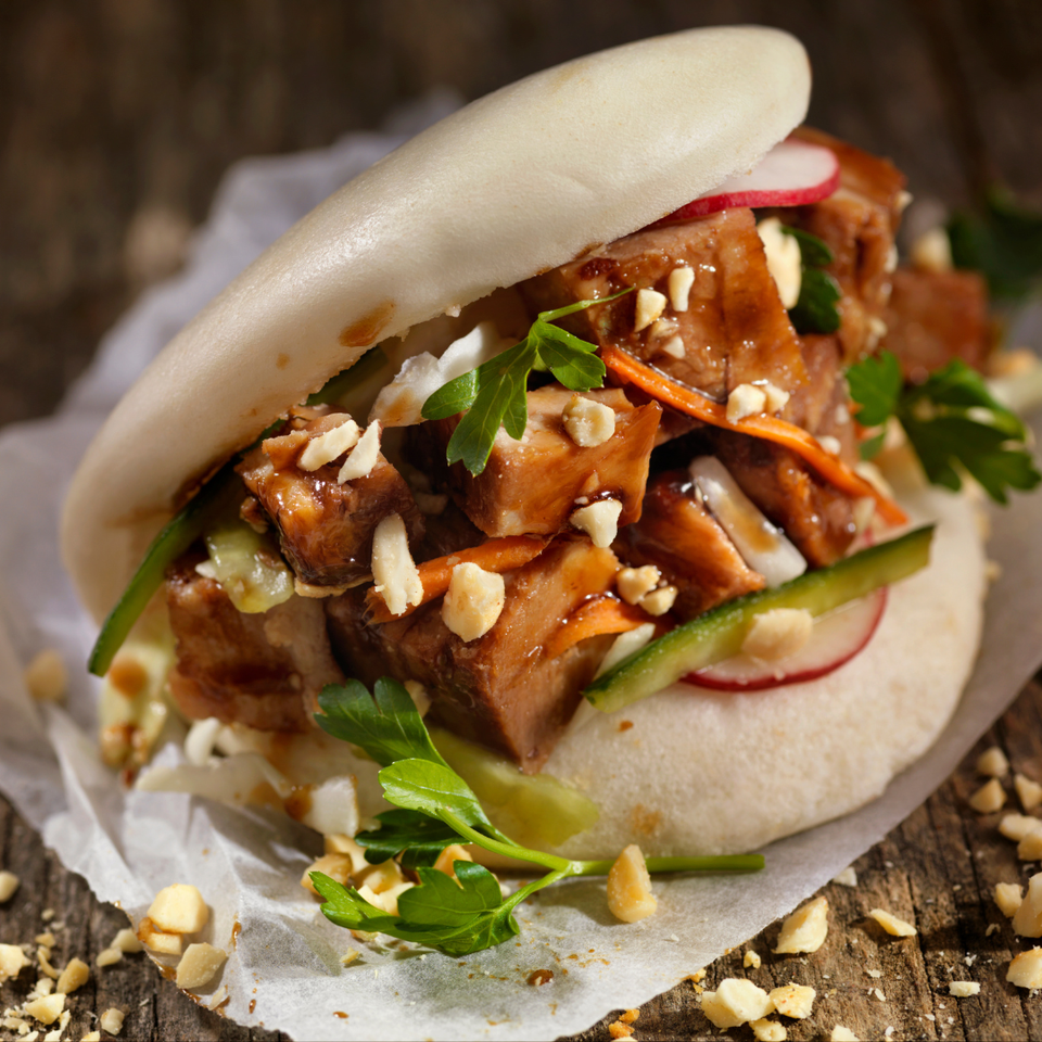 Bao bun gevuld met malse pulled chicken, overgoten met rokerige BBQ-saus, afgemaakt met frisse lente-ui en een crunchy topping van krokante uitjes. Een smaakexplosie om van te watertanden